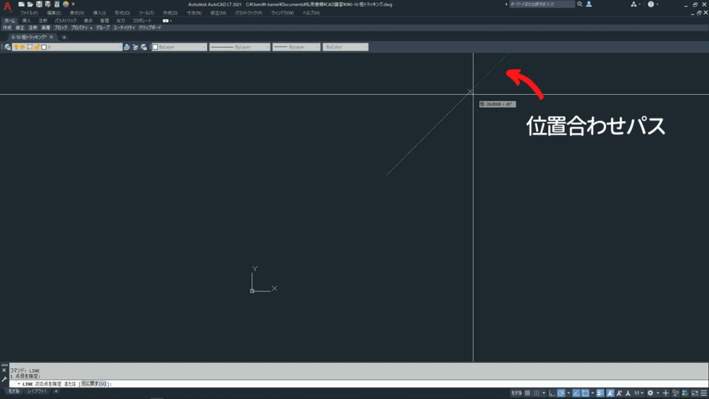 極トラッキングがオンの状態時、作図の際に設定した角度付近でカーソルが吸着され位置合わせパスが表示されます。