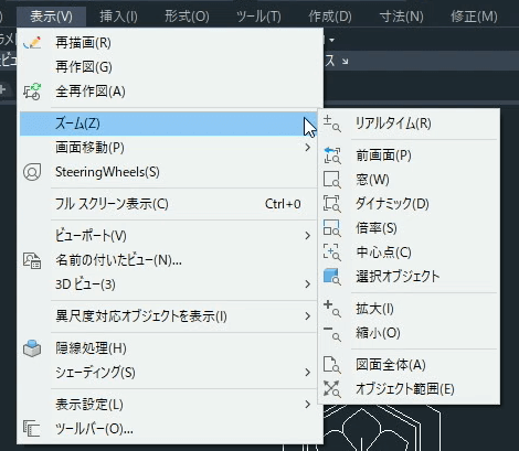マウスで表示変更の操作は直感的に使えますので基本的にマウス操作だけで十分ですが、図面全体を表示する方法などコマンド操作も覚えておきましょう。